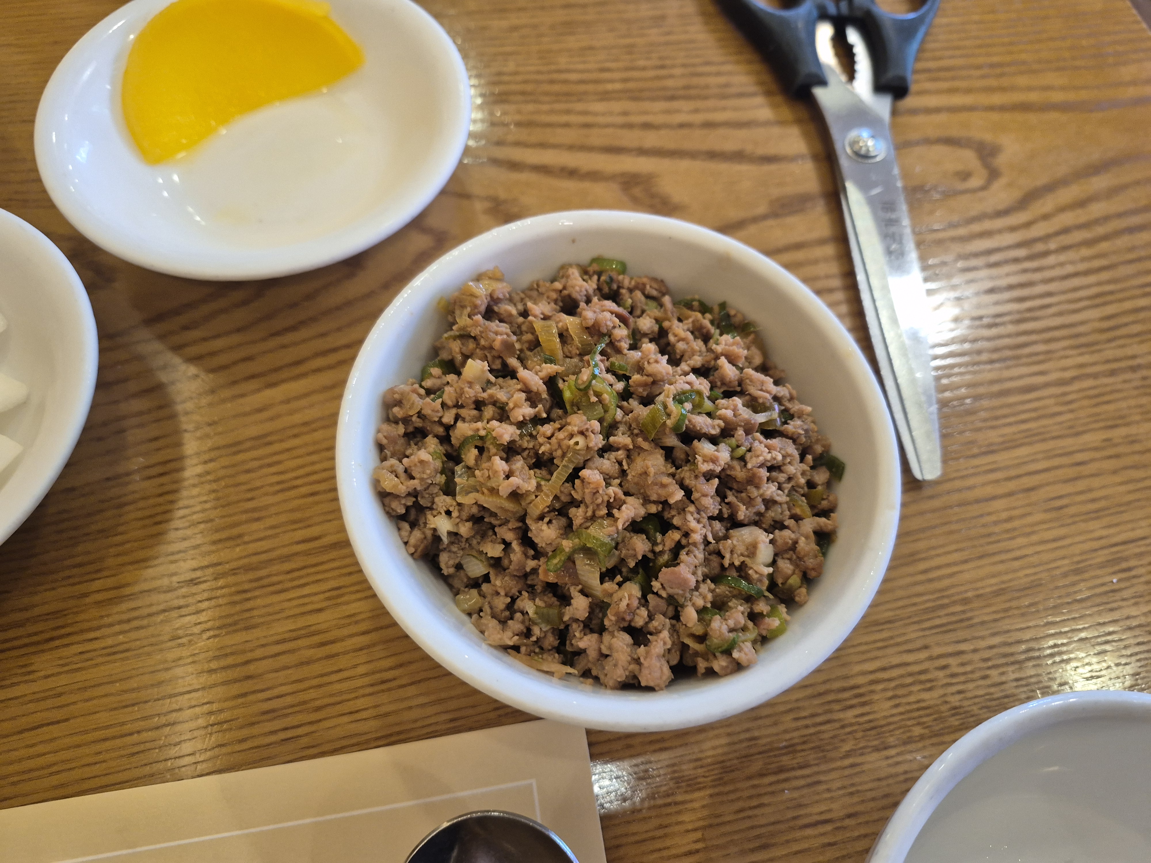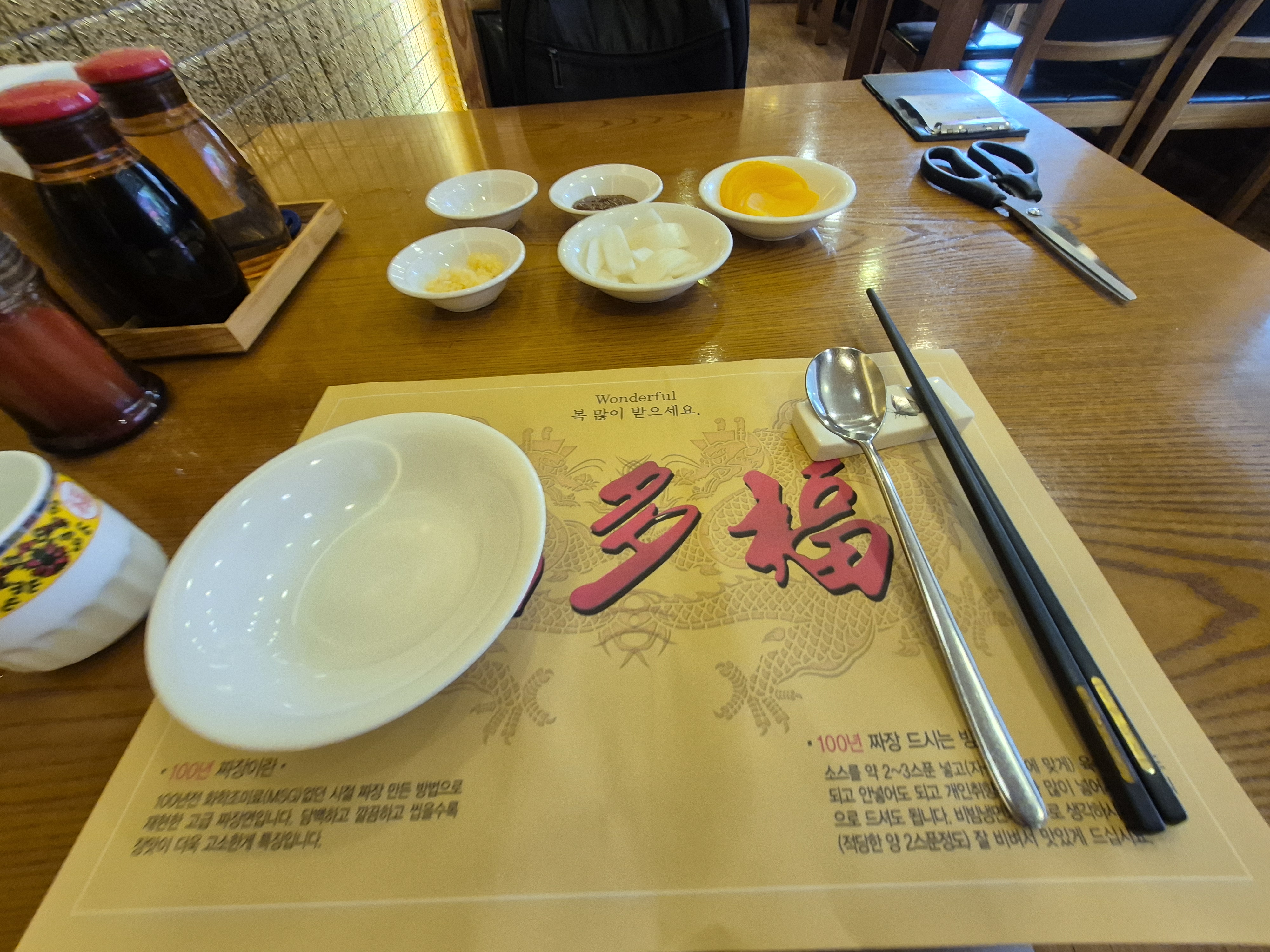 기본반찬과 장을 주는데 일반적인 춘장이 아니라 중국 황장을 줍니다. 맛은 좀더 된장에 가깝지 않을까 싶습니다.