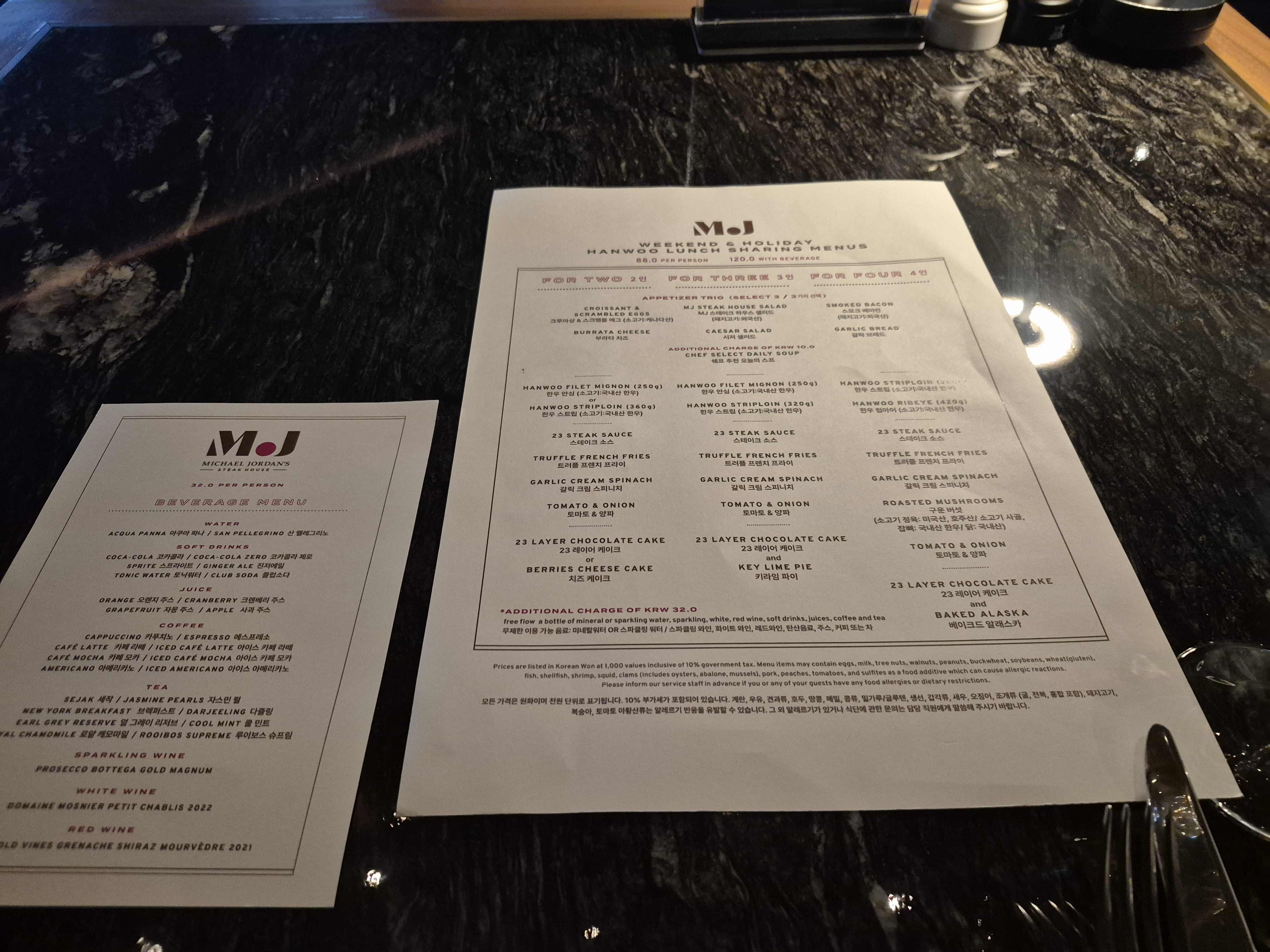 전에도 갔었지만 마이클조던 스테이크하우스에서 제공을 하는 스파쿨링 와인 종류가 궁금해서 서빙하시는 분에게 물어보니 이렇게 와인 상표를 보여줬습니다.
