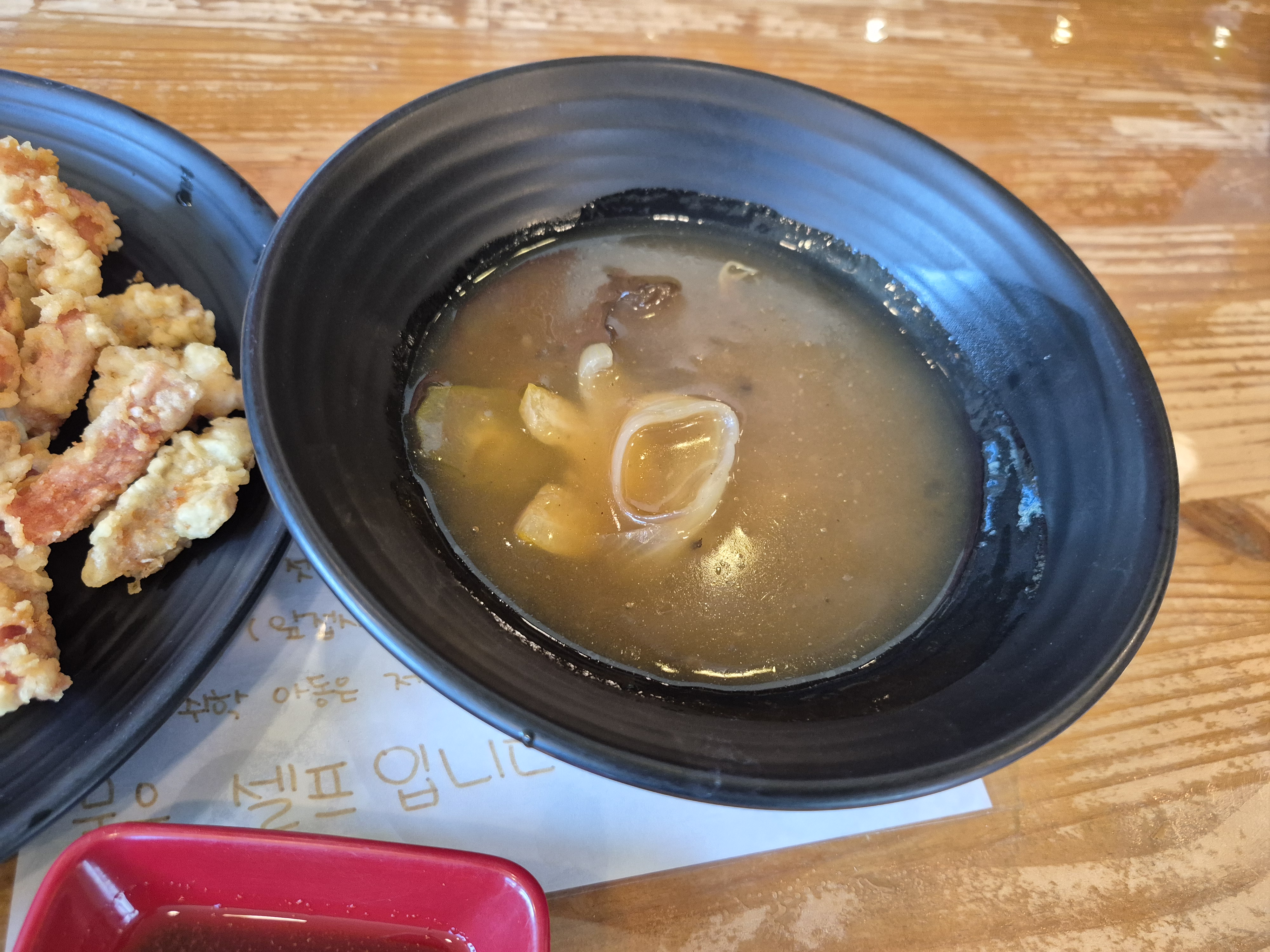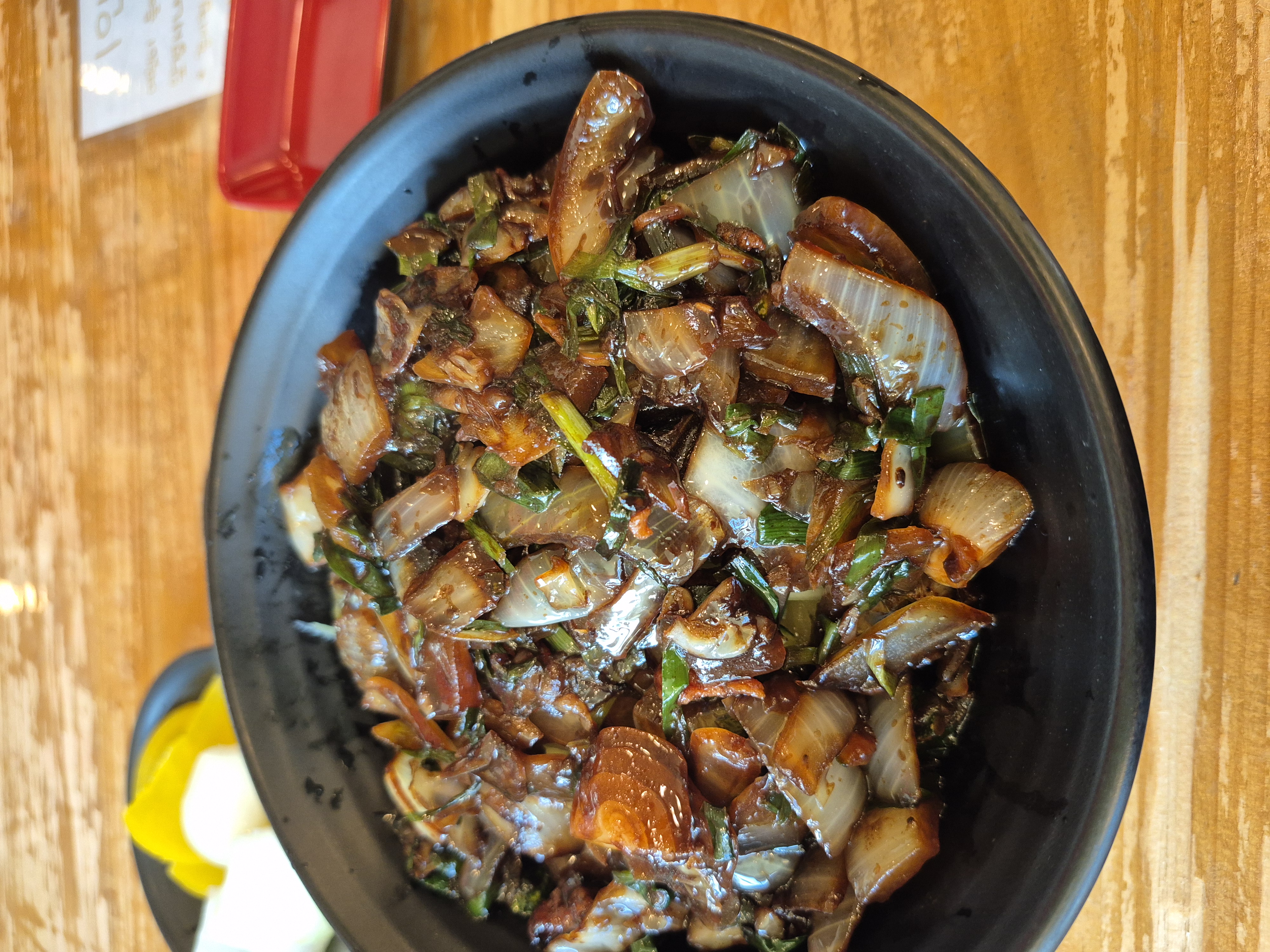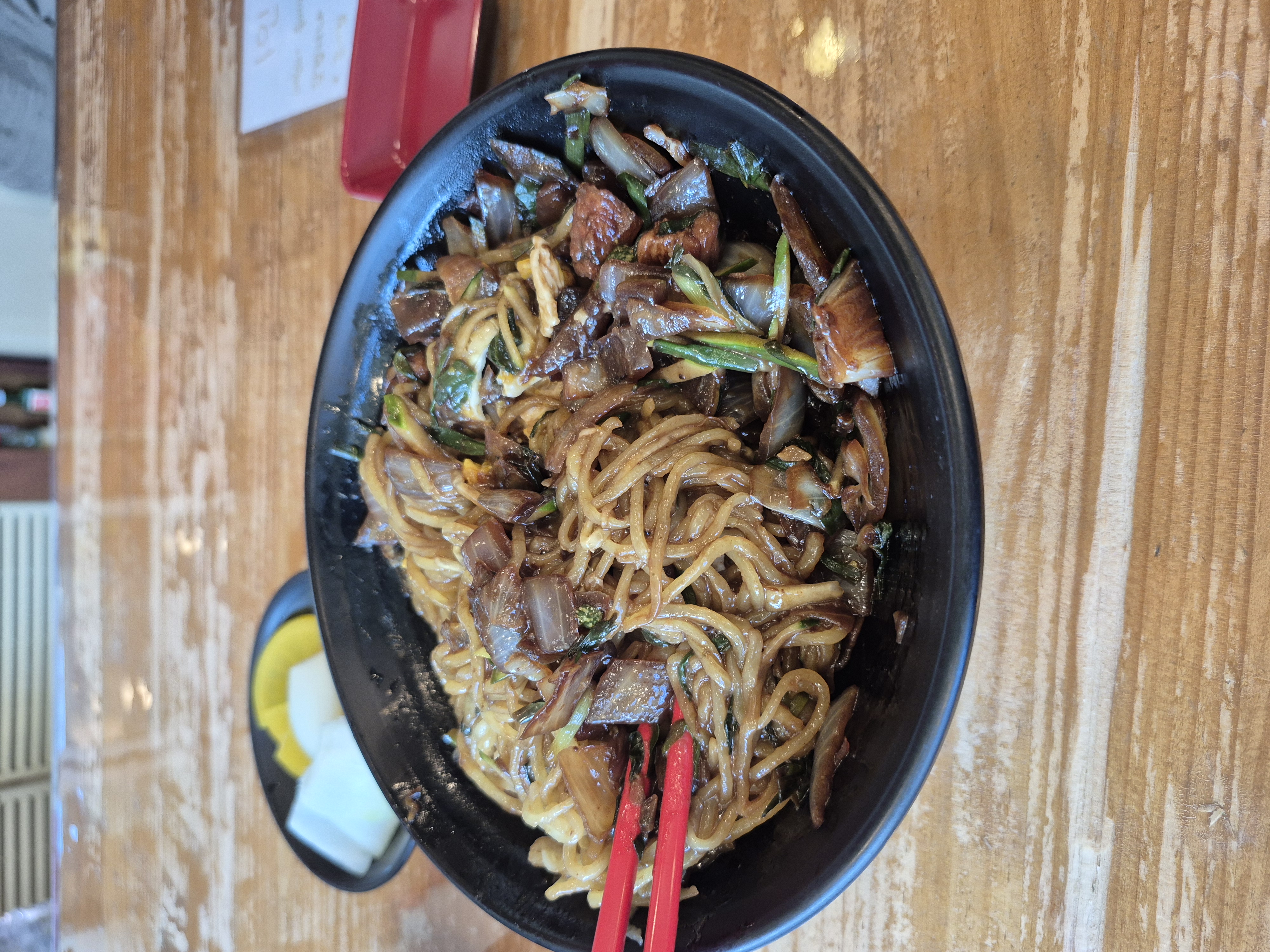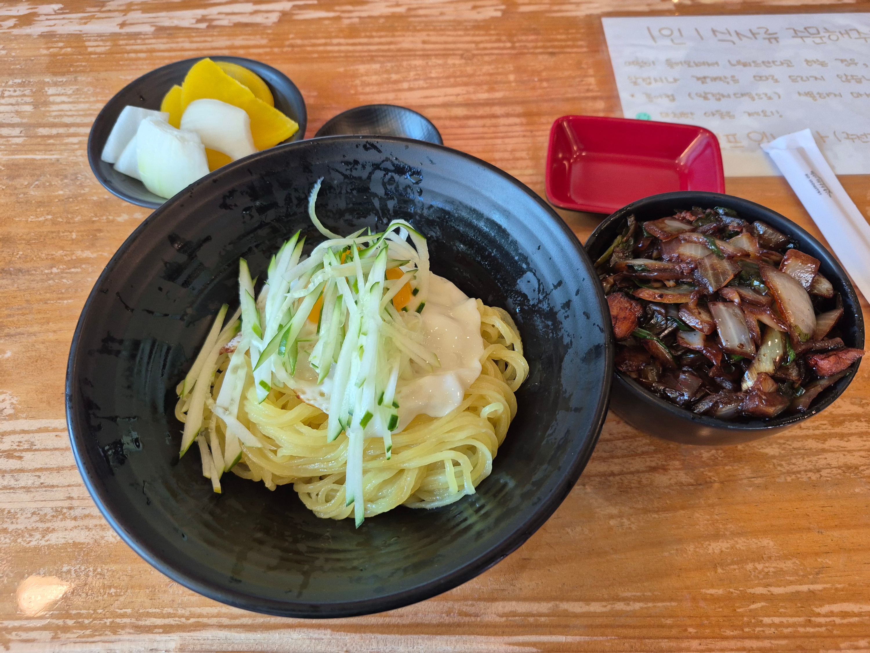 간짜장소스에 얇은 면을 비벼서 먹었습니다. 부추가 들어간갓이 특이합니다.
